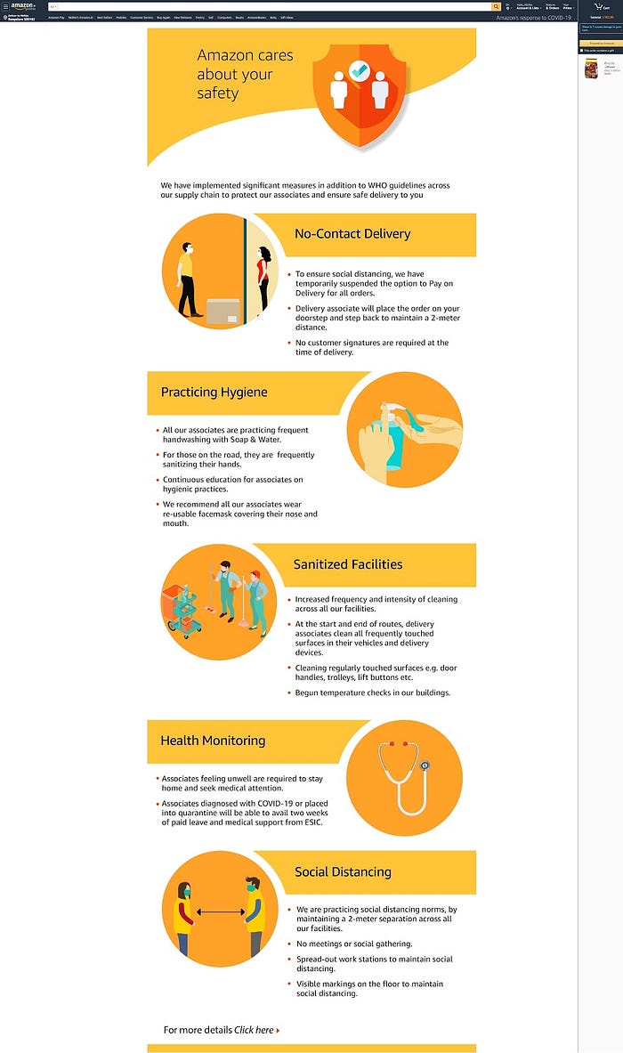 - A separate COVID-19 response page – Create a landing page to reassure your customers about the steps you have in place to deal with the outbreak. While this might sound redundant, the general public this affirmation. You can easily set up a landing page to keep updated with new information for customers and showcase your empathy toward their concerns. Amazon is a great example. Their dedicated safety-section lists the steps they are taking to address their customer’s concerns. WordPress users can follow suit and add a similar page using a landing page plugin, and double down by adding a COVID update tab to their homepage with the COVID-19 Update Plugin. Marketing services like Mailchimp also provide landing page tools.